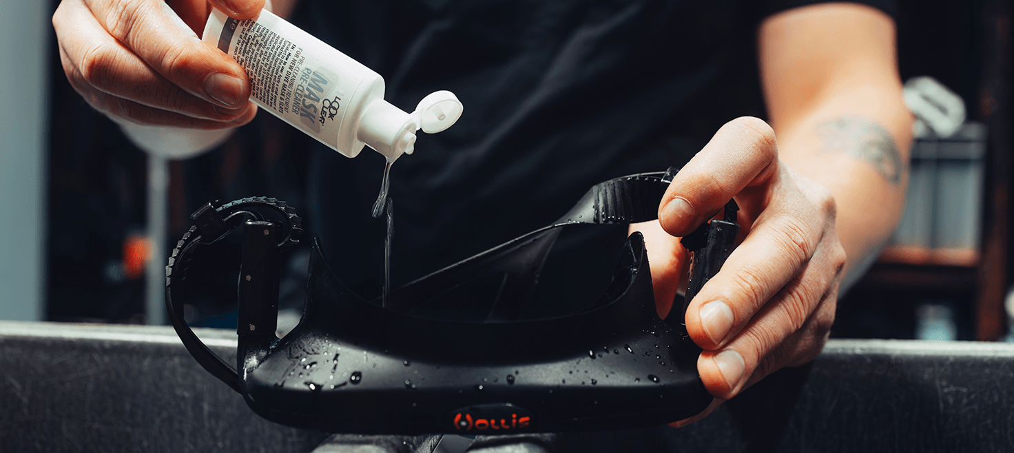 Når du modtager en ny dykkermaske, sidder der ofte rester af silikonefedt fra produktionen på indersiden af glasset. Det er netop dette usynlige lag, der ofte får masken til at dugge. Start derfor med at tage masken ud af sin opbevaringsboks og lad den "dampe af" i et par dage. Herefter anbefaler vi en grundig rengøring af maskeglasset.